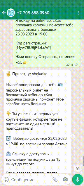 Лиды которые регистрируются в форме заявки, но не отправляют сообщения в ватцапе, "дожимаются" с помощью sms и доходят до вебинара.